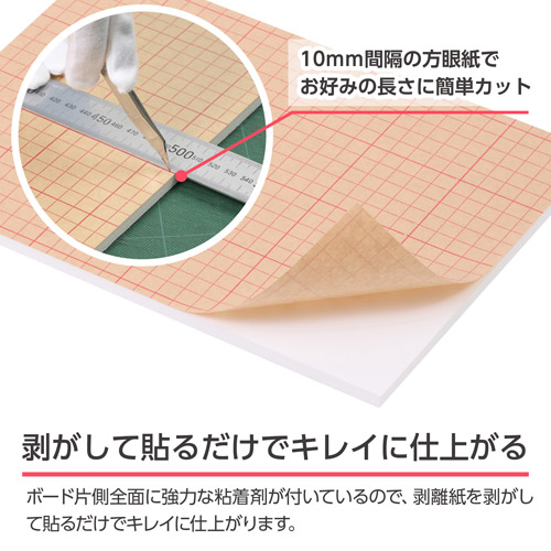 ボード片側全面に強力な粘着剤が付いているので、剥離紙を剥がして貼るだけでキレイに仕上がります。剥離紙は10mm間隔の方眼入りなのでカッターなどでお好みの長さや形にカットすることができます。