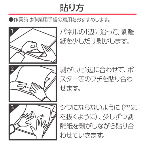 剥離紙を剥がして写真やポスターを貼るだけで簡単にディスプレイできる粘着剤付きのパネルボードです。高密着性で気泡が入りにくく、「反り」対策の特殊加工も施したプロ仕様。