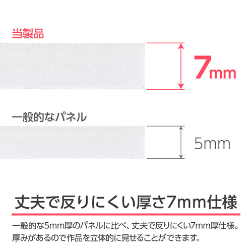 一般的な5mm厚のパネルに比べ、丈夫で反りにくい7mm厚仕様です。厚みがあるので作品を立体的に見せることができます。