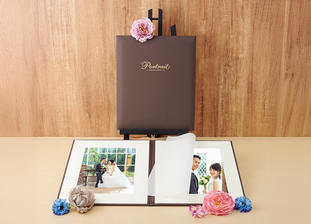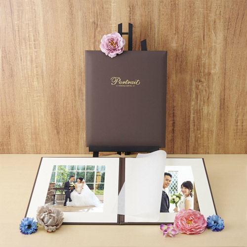 高級感のあるシボ入りの表紙![]() 落ち着いたブラウンの表紙には上品さを演出するシボ加工を施しました。 | 金箔押しの表紙カット![]() 金の箔押しで入れた表紙カットが、大切な写真をより趣きのあるものへと演出します。 |