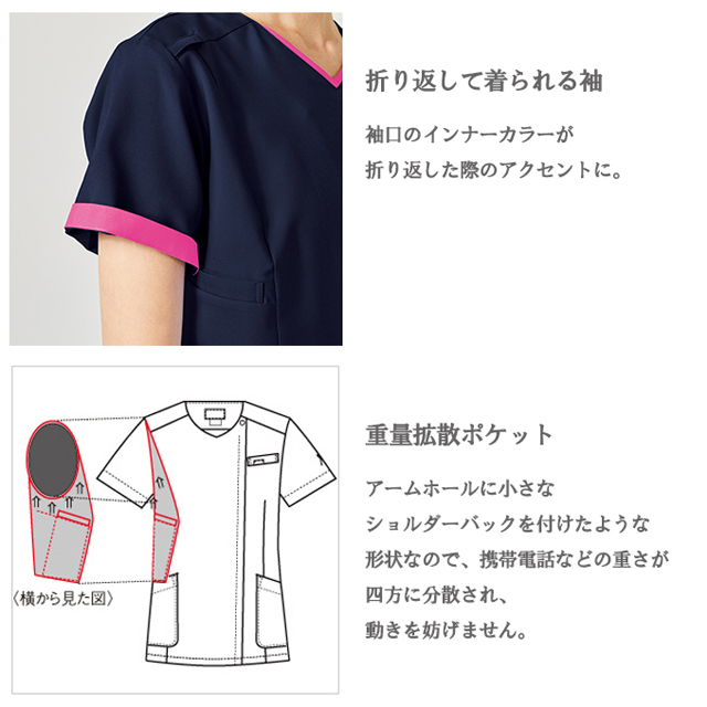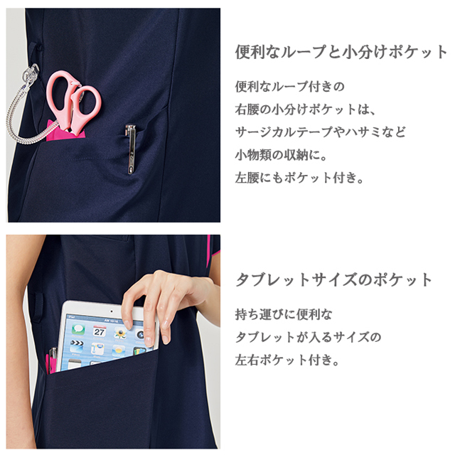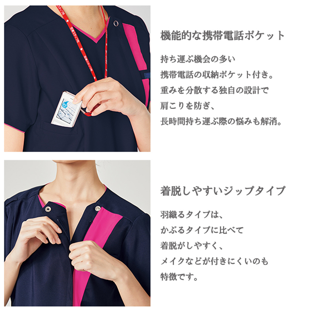 印象的な縦の切り替えはスポーティーでアクティブな印象与えるカッコイイ女性用スクラブ。右腰の小分けポケットは、サージカルテープやはさみなど小物類の収納に便利なループ付き。グッドデザイン賞受賞のジップスクラブのシリーズ。強固なマスト(帆)をイメージして開発した素材イリアスマストを使用。機能糸クールエスパーは速やかに体の汗を吸い取ります。羽織るタイプは、かぶるタイプに比べて着脱がしやすく、メイクなどが付きにくいのも特徴のレディースジップスクラブです。