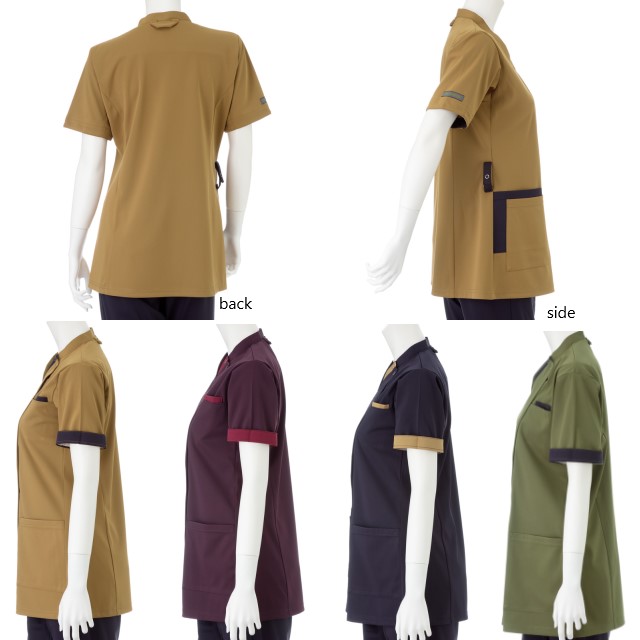 フロントファスナー開きで着脱しやすい男女兼用のスクラブです。