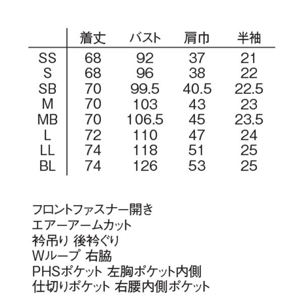 ●特徴:フロントファスナー開き、エアーアームカット、後ろ衿ぐり衿吊り、右脇Wループ、左胸ポケット内側PHSポケット、右腰内側ポケット仕切りポケット