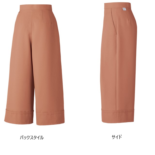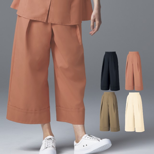 短めの着丈でワイドなシルエットながらウエスト部分を絞り、メリハリのあるパンツ。