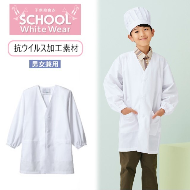 抗ウイルス加工素材を使用した、シンプルな前開きタイプの給食衣です。