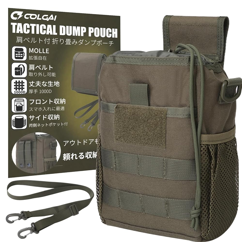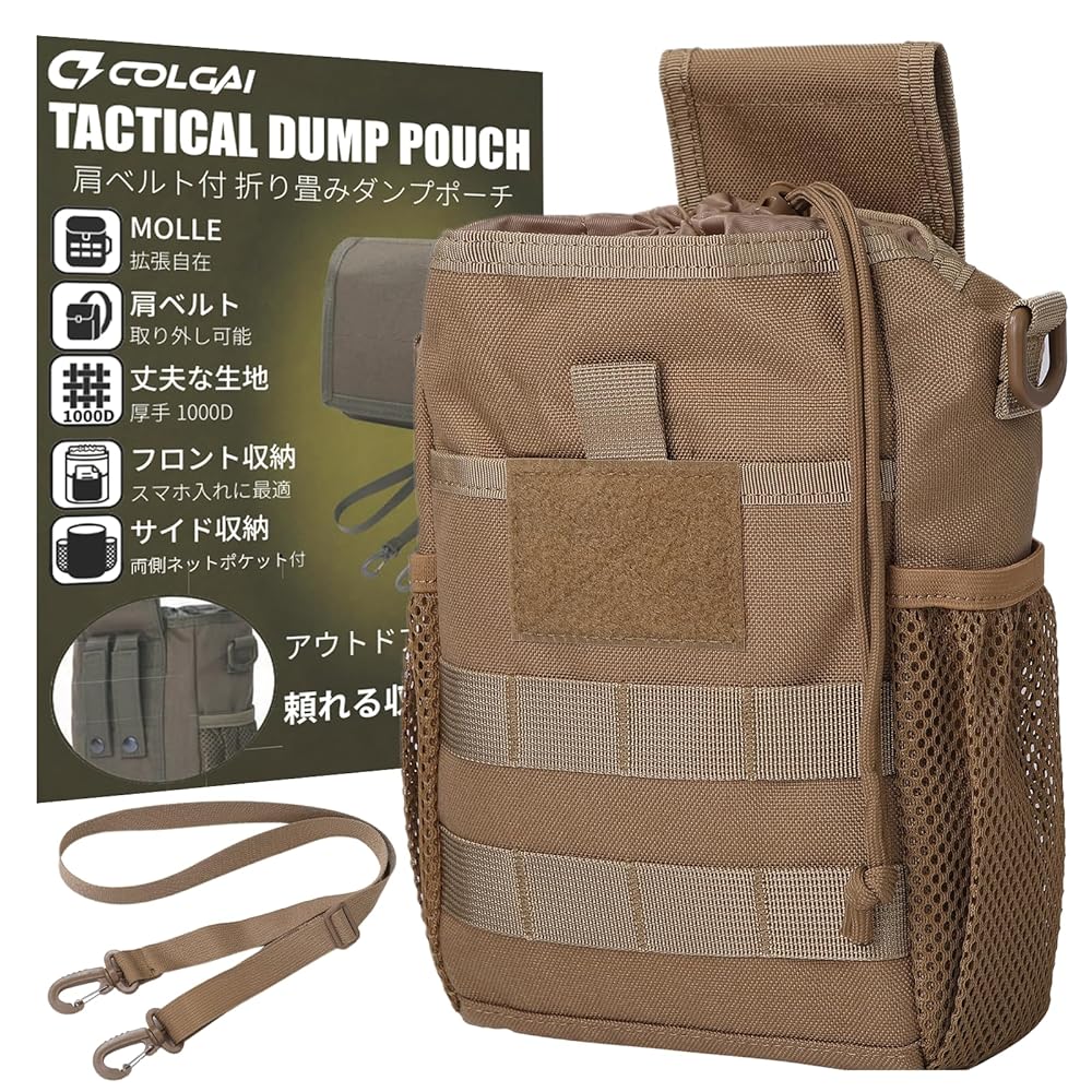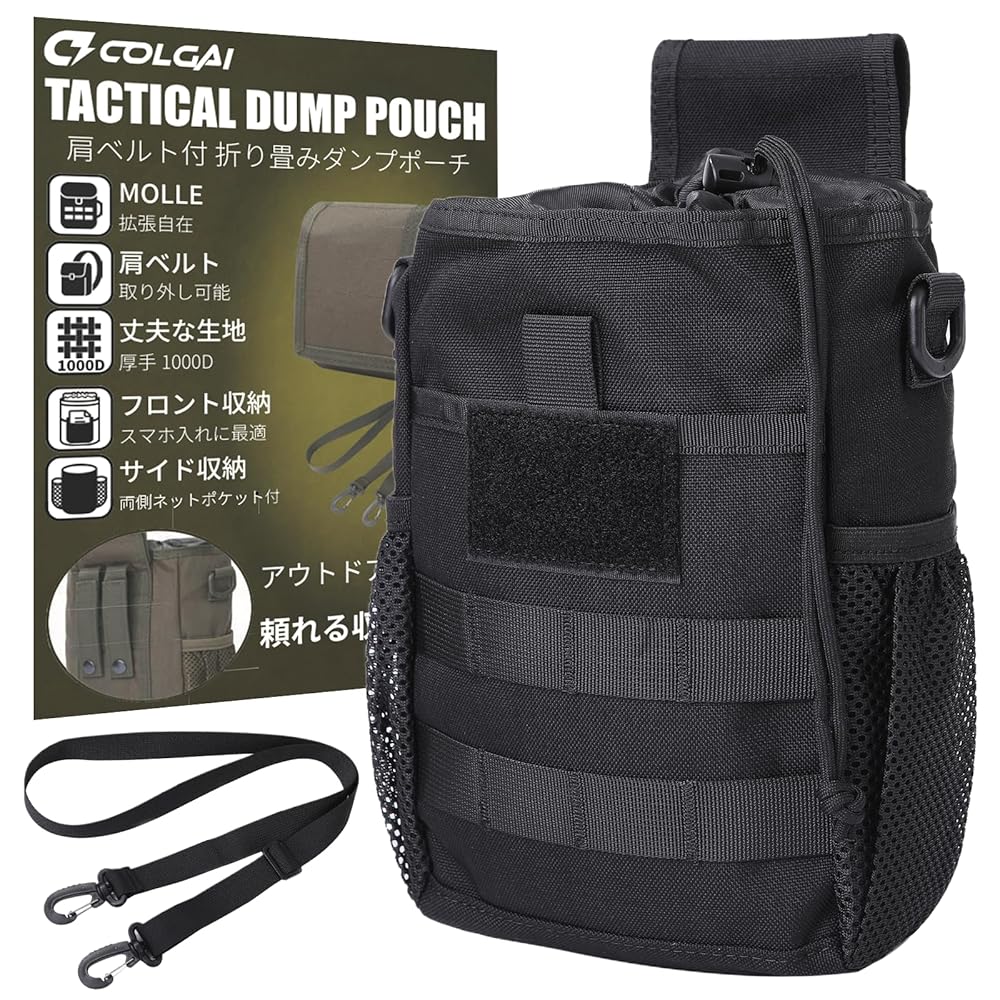 COLGAI ダンプポーチ 折りたたみ式 1000Dナイロン ショルダー付き 3WAY仕様 MOLLE メッシュポケット ミリタリー ブラック