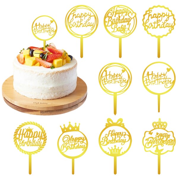 ゴールド ケーキトッパー 9枚セット Happy Birthday ケーキ挿入カード お誕生日 ウエディング 結婚式 パーティー ケーキ飾り 飾り付け (9pcs)