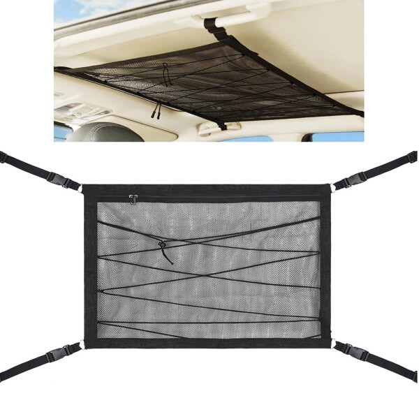 yowodana 車 天井ネット 車内天井収納ラゲッジネット 荷物固定 ルーフネット 車載 調整可能 バックル固定 2層タイプ ファスナー付き荷物落下防止 軽自動車 コンパクトカー 旅行 車中泊 アウトドア 80*55cm