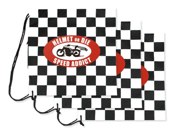 3枚SET販売ですが、価格は2枚分なので1,320円お得です!!(実質1枚無料)ヘルメットがスッポリ入るサイズ感。オフロード系のフルフェイスや、大きめサイズのフルフェイスヘルメットも収まる様に、マチも付けました。「SPEED ADDICT(スピード アディクト):スピード依存、スピード中毒」単車乗りが愛して止まない「スピード感」をフュチャーしました。1948年、ボンネビルフラッツで世界最高速に挑み、VINSCENTで240Km/hを記録した「Rollie Free」氏の写真。この有名且つカッコ良過ぎる写真を「HANDWRITTING(手書き風)」にアレンジしました。海パン革靴スタイルに、この乗車姿勢。正に「SPEED」を体現するのに、これ以上の写真はありません。男の浪漫が結実しています。ショルダータイプで、乗車時に斜め掛けできます。サイドファスナー付きですので、背負ったまま小物等の取り出しも可能です。素材は繊維を熱