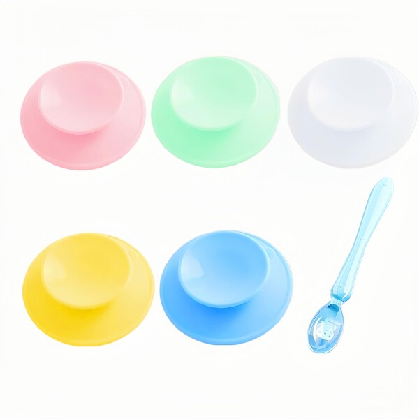 【セット内容】:吸盤5個、スプーン1個。カラーはイエロー、ブルー、グリーン、ホワイト、ピンク。サイズはテーブル設置面直径9.5cm、食器設置面直径6cm。