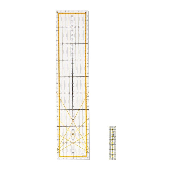 45×10cm定規は、パッチワークやキルティングに便利なサイズです。ロタリーカッターを使用してストリップを切ったり、角度をマーキングしたりするために最適です。30度、45度、62度の対角線が、左手でも右手でも使えるようにマークされています。黒と黄色で明確にマーキングされた透明アクリル製です。
