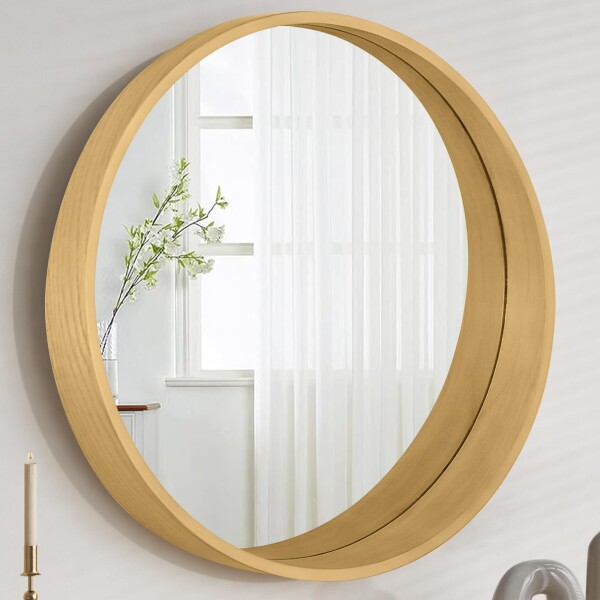 Browgrow 壁掛けミラー 壁掛け鏡 木製 鏡 丸型鏡 ウォールミラー 天然木フレーム 丸鏡 円形ミラー 飛散防止 洗面 玄関 化粧 (ナチュラル、直径30cm)