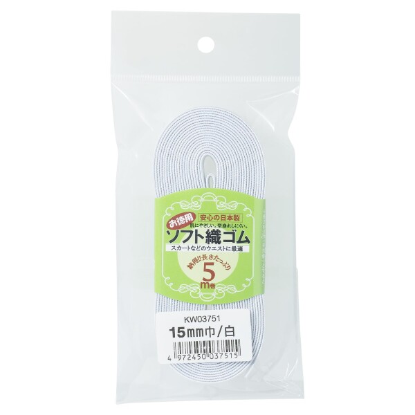 | 商品名 | ソフト織ゴム 5m巻 白 (15mm, 白) ウエストゴム ウエスト 裁縫 裁縫道具 手芸 スラックス スカート パジャマ |