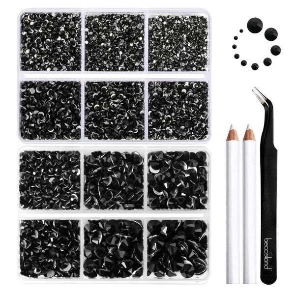 ビーズランド(Beadsland)8,300個 フラットバック ブラックのライン クリスタルラインストーン 手工芸用 10サイズ混合 ワックスペンシルとピンセットキット付き、SS3-SS30