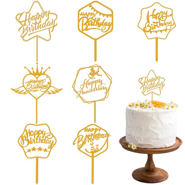 ゴールド ケーキトッパー 7枚セット Happy Birthday ケーキ挿入カード お誕生日 ウエディング 結婚式 パーティー ケーキ飾り 飾り付け (7枚セット)