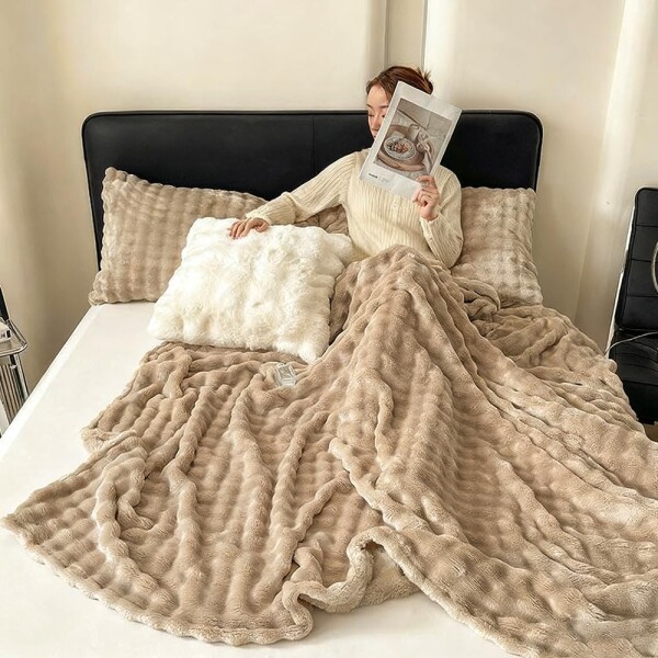 【ふわとろ毛布】ラビットファー調加工薄手毛布、ふんわりとしたなめらかな肌触り、高級感up、保温&吸湿&通気性良い、おしゃれなお部屋を演出してくれ、冷房対策、春夏秋冬一年中でも快適にお過ごしいただけるブランケットです。立体的な凹凸のあるデザインが、優雅で洗練されたスタイルを引き立てます。