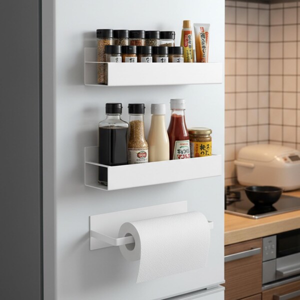 【強力な磁気ストレージ】 マグネット 調味料ラック 高品質の炭素鋼を採用し、マグネット吸着棒の幅が広く、磁力が強く、冷蔵庫の表面にしっかり吸着でき、落ちにくい。 穴を開けずに設置でき、冷蔵庫を傷つけず、安定性が高い。