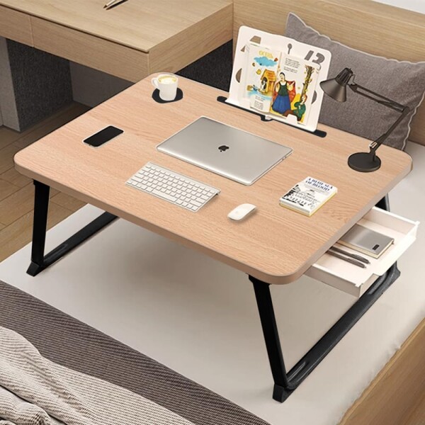 オーク色 折り畳みテーブル ローテーブル PCデスク ベッドテーブル 大容量表面 多機能 軽量 ソファ オフィス 食事 利用可 多色 (カードスロット + カップホルダー + 読書スタンド, 60*40*28cm)
