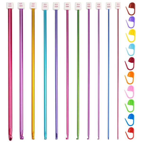 KDSSYFT アルミ編み針セット 2.0〜8.0mm 27cm かぎ針 アフガン針 レース針付き カラフル 段数マーカー