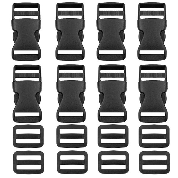 セット内容:プラスチックバックル8個 +アジャスター8個、合計16個入り。 バックル内径、アジャスター内径:25mm。