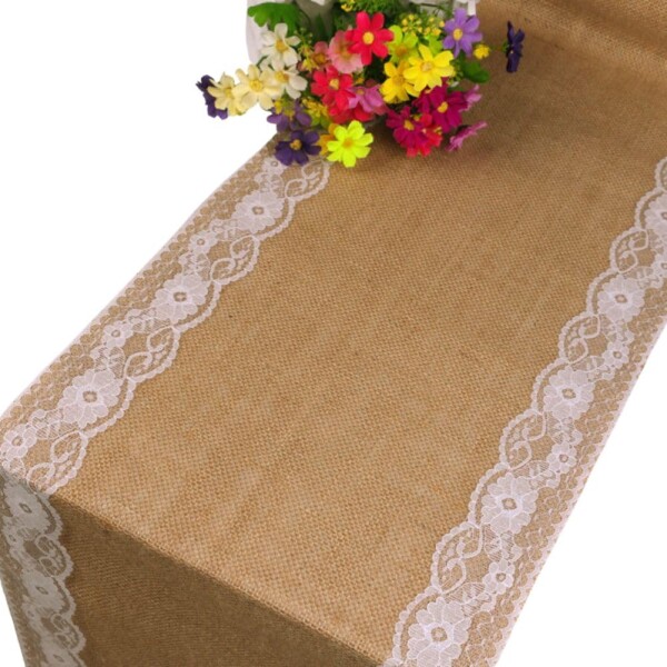 テーブルランナー ジュート レース 黄麻布 結婚式 パーティー ダイニング カントリー ナチュラル 30×180cm 30×220cm 30×275cm (フラワーレース, 30cm×275cm)