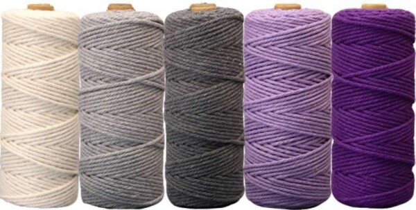 ?【包装】5巻マクラメ ロープ 紐 糸、5種類の異なる色があり、ディープバイオレット/ライトバイオレット/ダークグレー/ライトグレー/ベージュ。1巻あたり約3mm x 50m(54ヤード)です。
