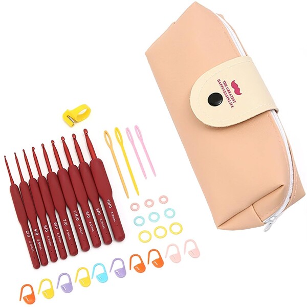 かぎ針 編み針 編み物 DIY 工具 ソフトハンドルかぎ針 手芸 目数段数計 段数リング 収納ケース付き 基本入門キット 小物付きセーター 帽子初心者 赤いかぎ針編み