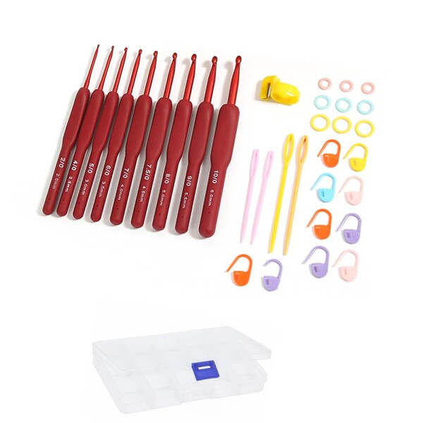 【豊富なセット内容】9本の赤いソフトハンドル付きかぎ針(2.0mm〜6.0mm)、10個のマーカークリップ、9個のリングマーカー、1本の糸切りはさみ、4本の縫い針、そして収納ケースが付いた合計34点の豪華セット。編み物初心者にも経験者にもぴったり。