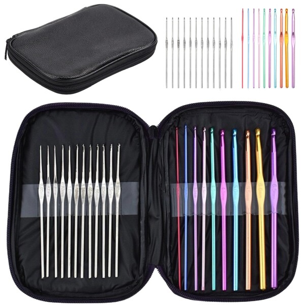 GRHONC かぎ針 22本セット 0.6mm-6.5mm かぎ針ケース PUレザー 編み針 レース針 10号 編み物 手芸 (ブラック, 22本セット)