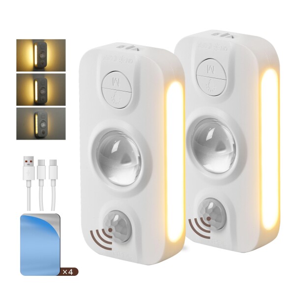 センサーライト 室内 USB充電式 フットライト 明暗・人感センサー 無段階調光 側発光 RGB 電球色 昼白色 足元ライト 省エネ 鉄片テープ付 階段 廊下 寝室 玄関 クローゼット 2個セット 日本語取扱説明書