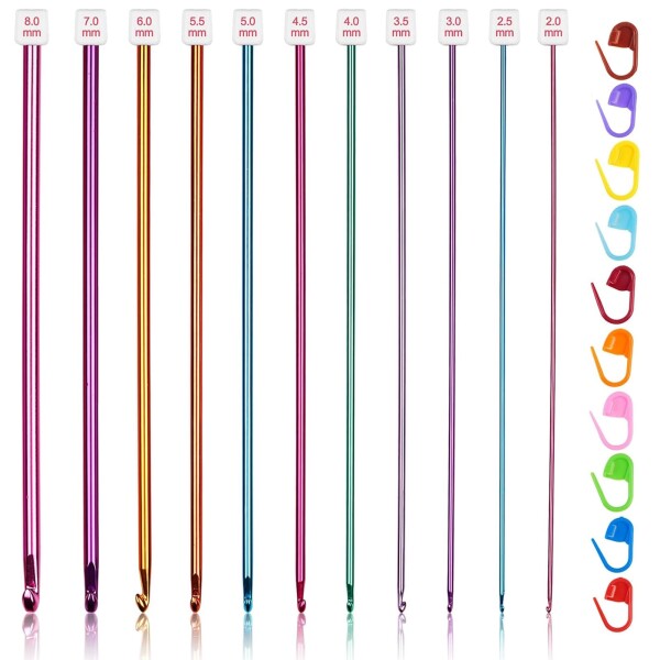 YuanVQuanWee アルミ編み針セット 編み棒 かぎ針 かぎ針 アフガン針 レース針付き カラフル 段数マーカー付き 落下防止 マフラー 帽子ニット プレゼント DIY 初心者 2.0〜8.0mm (11本のフック針+10個のマーカー)