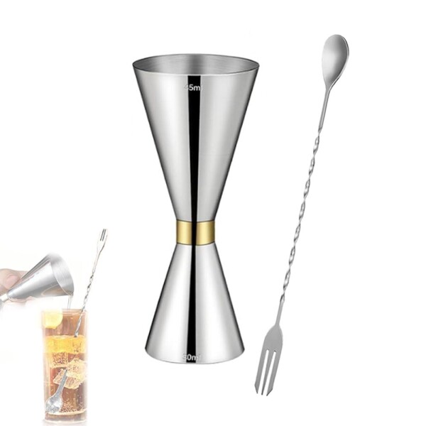 WIOOYIUU 304ステンレス製 一体型ジガーカップ 目盛り付き 30ml/45ml カクテルメジャー&バースプーンセット 量酒器 ウイスキー計量 カクテル道具 バーテンダー用品 マドラー 長柄カクテルスプーン
