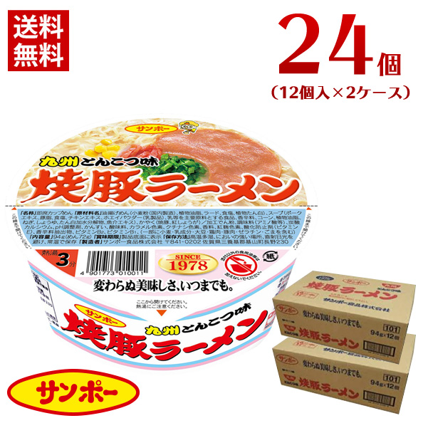 送料無料 サンポ― 焼豚ラーメン 24個(12個入×2ケース)インスタントラーメン 九州 カップ麺 ケース売り(北海道・沖縄別途送料)