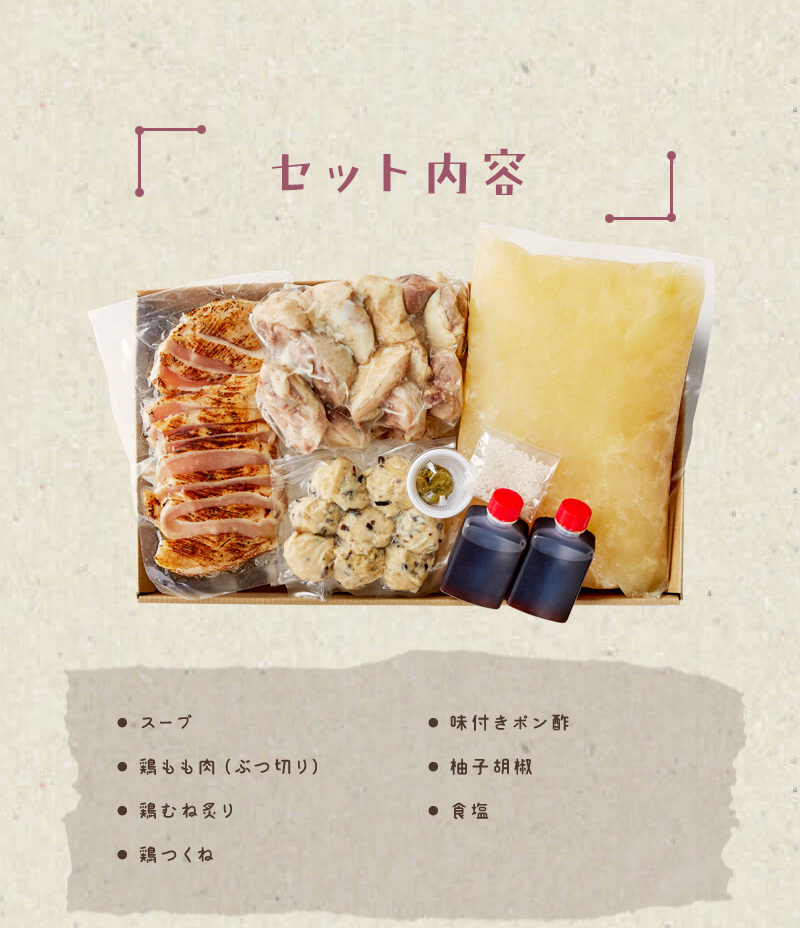 内容量:スープ/鶏つくね/鶏ももぶつ切り/鶏むね炙り/薬味(味付きポン酢、柚子胡椒、食塩)/計4〜5人前