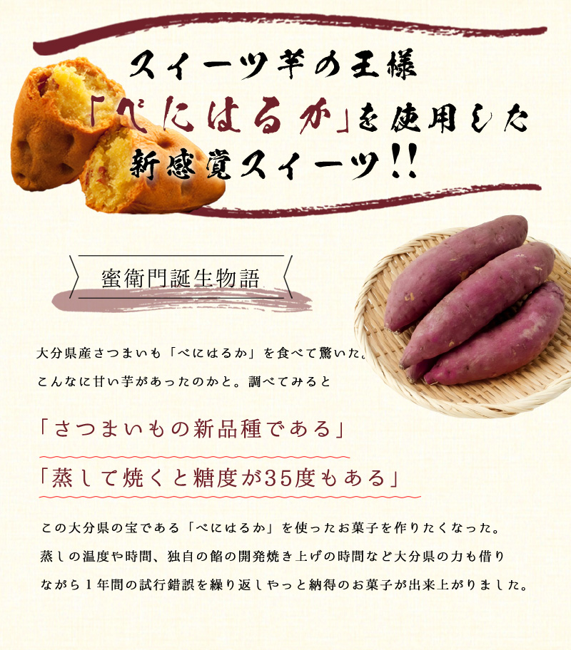 原材料名: さつま芋(べにはるか)(大分県産)、砂糖、小麦粉、和三盆糖蜜、マーガリン、全卵、加糖卵黄、乳等を主要原料とする食品、バター、水飴、蒟蒻加工品、食塩/トレハロース、着色料(カラメル、クチナシ、コチニール、紅麹、カロチン、V.B2)、膨脹剤、香料、乳化剤、安定剤(アルギン酸Na、CMC、増粘多糖類)、リン酸塩(K、Na)、水酸化Ca、酸化防止剤(V.E)、(一部に卵・乳成分・小麦・大豆を含む)