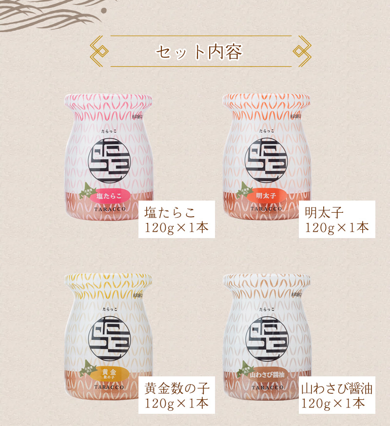 ◆内容量…無着色たらこ120g×1本/明太子120g×1本/ 黄金(数の子120g×)1本/山わさび醤油120g×1本