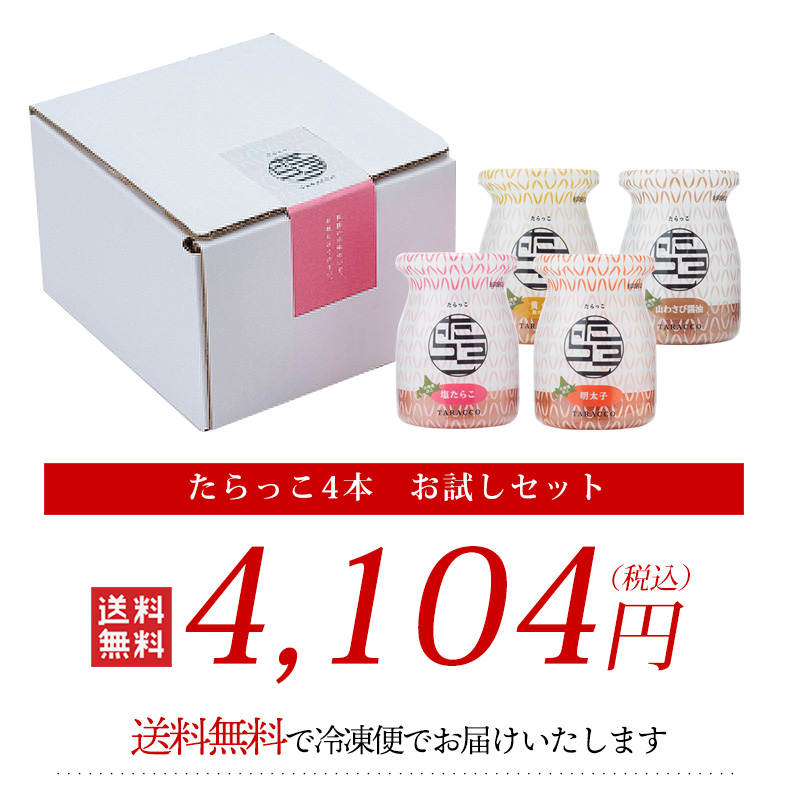 ◆商品名…たらっこ4本 お試しセット(無着色たらこ1本、明太子1本、数の子1本、山わさび醤油1本)