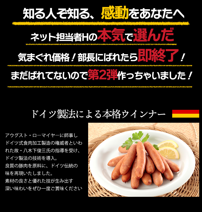 商品紹介:ネット担当者Hの本気で選んだ気まぐれ価格部長にばれたら即終了セット第二弾が登場です!!前回よりボリュームアップした7種類のこだわりのウインナーはどれもジューシーでたまりません!コスパ最高のウインナーセットです。部長にばれたら終了です。(まだばれてません)