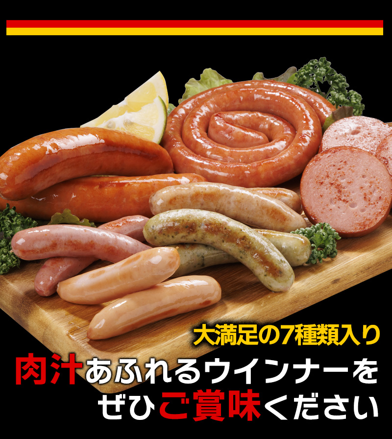 内容量:荒挽き生ソーセージ210g/骨付きフランク300g/ぐるぐるウインナー170g/かぼすウインナー100g/冠地どりウインナー100g/荒挽き生ソーセージバジル210g/ボロニアソーセージ300g