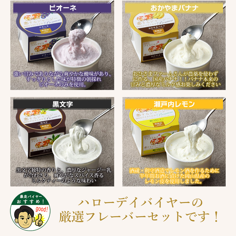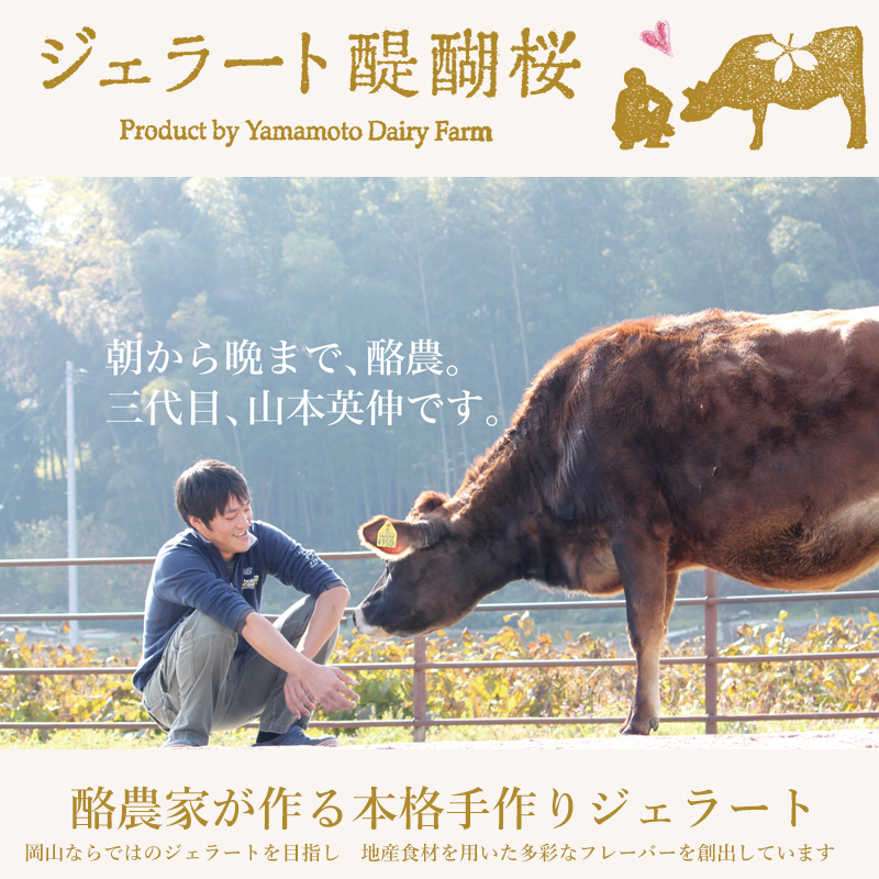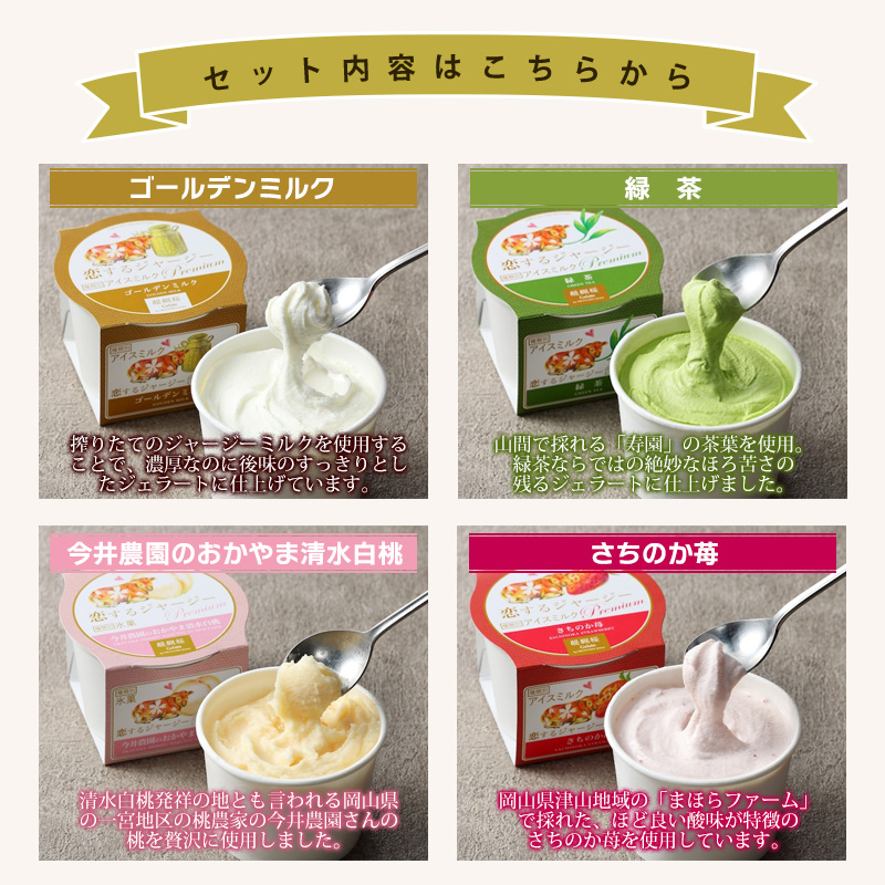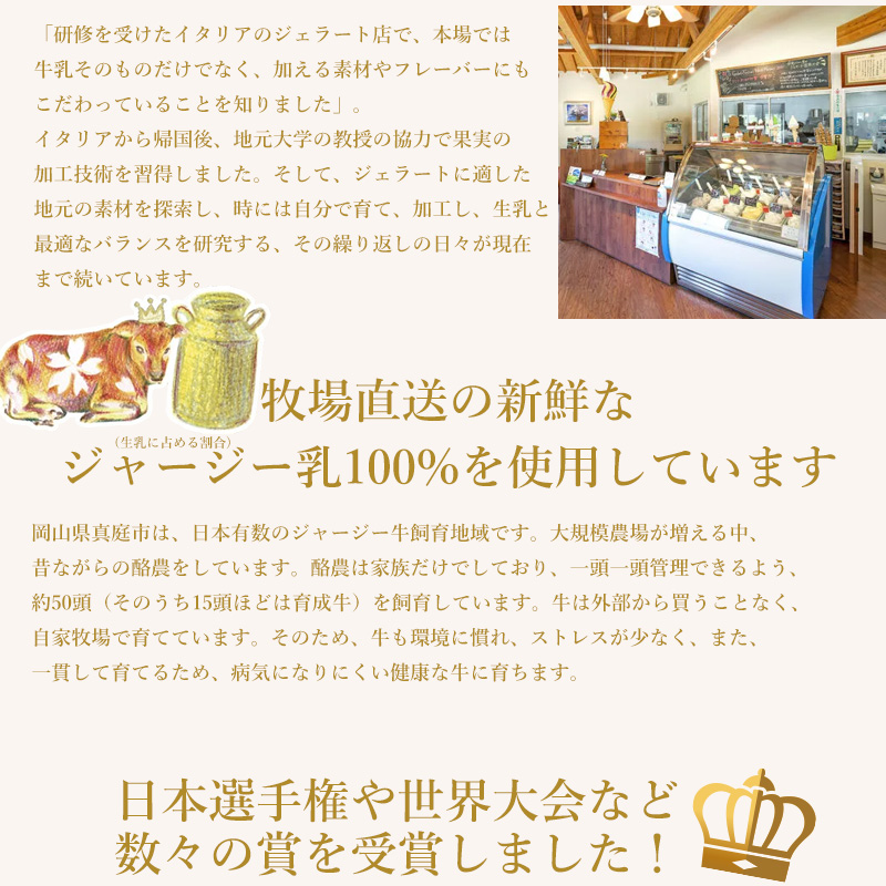 ◆商品説明:岡山産まれ、岡山育ちのジャージー牛たちが、素敵な素材に出会って恋をして産まれたジェラート。さらに、Premiumでは岡山産の厳選された素材にこだわって作っています。日本有数のジャージー牛飼育頭数を誇る、岡山県真庭市で三代にわたり、酪農を営んでおります。酪農家ならではの、搾りたてのジャージーミルクを使用することで、濃厚なのに後味のすっきりとしたジェラートに仕上がっています。各フレーバーすべて、厳選した素材で、素材本来の味を活かしたジェラートに仕上げておりますので、ぜひご賞味くださいませ。