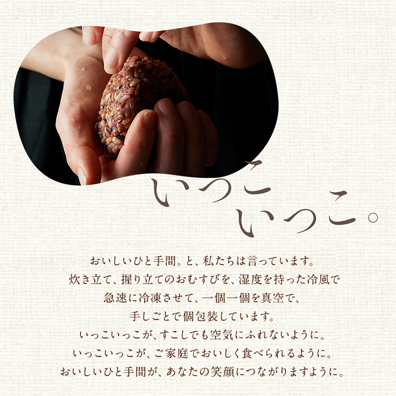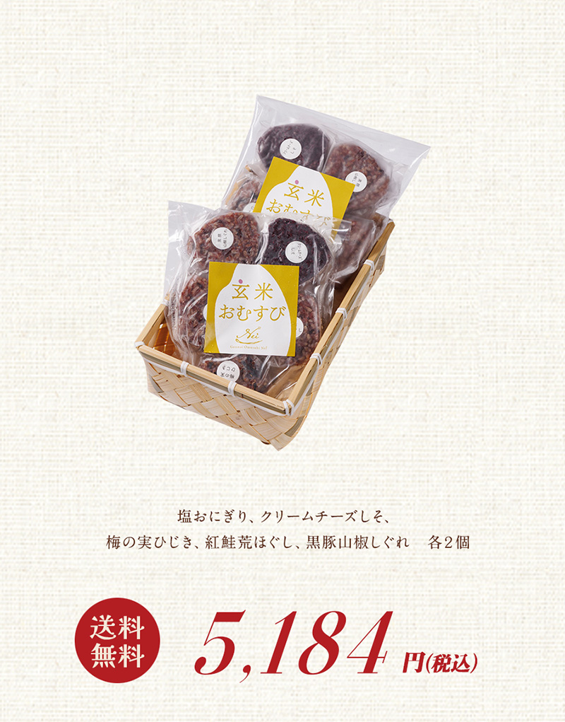内容量:塩おにぎり、クリームチーズしそ、梅の実ひじき、紅鮭荒ほぐし、黒豚山椒しぐれ 各2個