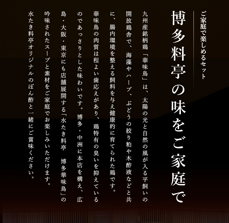 内容量:水たき生スープ600g×3 華味鳥 切り身 300g×2 華味鳥 ぶつ切り 300g×1 華つくね 200g×1 博多ぽん酢 220ml×1 ちゃんぽん麺 150g×1