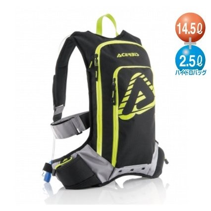 【容量】14.5L 【商品説明】クロスショルダーベルトでしっかりホールド エキスパート仕様ハイドロバッグ ● ●バックパックは14.5Lの大容量、ハイドロバッグは給水がしやすいメモリ付きの2.5Lとレースシーンから ツーリングまで様々なシーンで活躍。大開口キャップの採用で給水しやすく洗浄もしやすくなっています。水量調節ができるバイトバルブ(吸い口)によりヘルメットを被ったままでも必要な量の水分補給が手軽にできます。 左右連結できる特徴的なクロスショルダーベルトで快適かつずれの少ないフィッティング、さらにウエストベルトでホールドすることで重さを感じさせません。背面は通気性に優れたエアスルーパッドを採用。 更に進化したエキスパート仕様のドリンクバッグです。 ● ●カラー: BLACK×YELLOW ●材質: ポリエステル ●容量: 荷室14.5L 2.5Lのハイドロバッグ付属