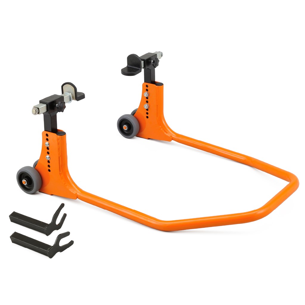 【適合】汎用 【商品説明】チェーン調整、リアタイヤを取り外す作業などリア周りのメンテナンスには欠かせないリアスタンドです。 ●新形状フレームと鋳造アームの採用により安心の剛性感。 ●リフトアップ時にはローラーが浮いてフレームが接地する構造にすることで、作業時の安定感が向上。 ●L型とU型アタッチメントを標準装備し、アタッチメント幅は無段階、高さは9段階の調節が可能です。 ●車両に合わせて適切な高さでリフトアップできます。 ●・幅(無段階) L型:260-390mm / U型:260-410mm ●・高さ(9段階) L型:218-319mm / U型:242-343mm ● ●スイングアームとスプールに対応したバイク用リアスタンド ●高さ9段階と幅の無段階調整により幅広い車種に対応 ●作業時に安定するように、リフトアップ時にはローラーが浮いてフレームが接地 ●対応スプール径:φ14-18mm ●耐荷重:200kg ● ●※左右で段違い等のスイングアームには使用できません。U型アタッチメントを使用する際は別途スイングアームスプールを購入する必要があります。
