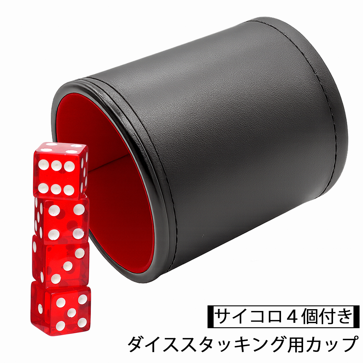ダイススタッキングやサイコロゲームに最適なPUレザー製ダイスカップと、透明感のある19mmクリアレッドサイコロ4個のセットです。