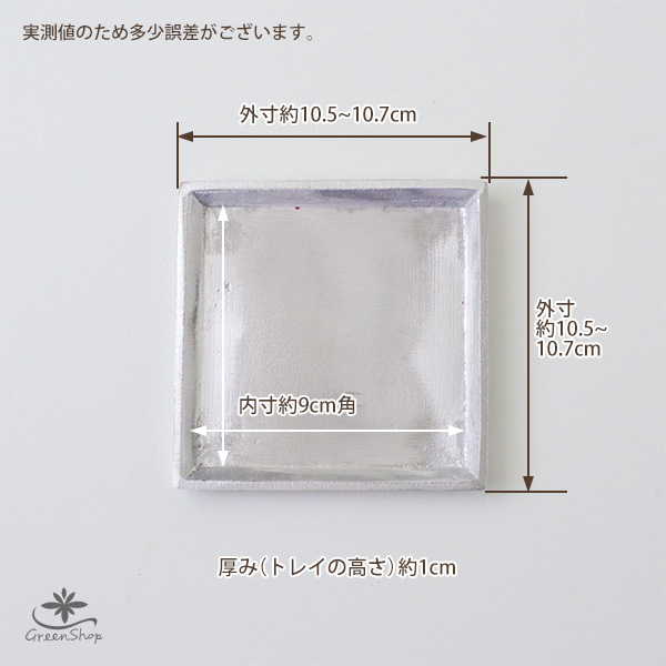 | サイズ | 外寸約10.5〜10.7cm角(内寸約9cm角)×厚み(高さ)約1cm |
