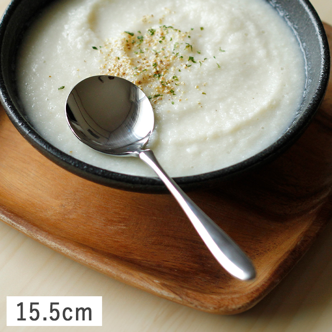 日常使いからおもてなしまで幅広く使え、手持ちのアイテムともコーディネイトしやすい。すらりと繊細で優雅なフォルムが魅力的なカトラリー。ファーストシリーズのブイヨンスプーンです。