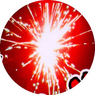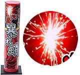 赤牡丹+錦冠 上空高く打ち上がり、炸裂音と共に赤星の牡丹の大きな輪が咲きます。(タコのお顔) そして、錦冠の火花(タコの足)がゆっくりと舞い散ります。 約20m打ちあがります。