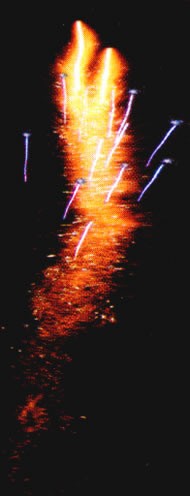 彗星のように金色の尾を引きながら打ち上がり、上空で鮮やかな青星が飛び散ります。 そして、先程の尾の残り火が、穏やかに舞い散ります。 高さ約20m打ちあがります。