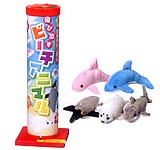 ペンギン、アザラシ、サメ、イルカ(ブルー)、イルカ(ピンク)の5種類のぬいぐるみが飛びだします。 ※飛びだすのは1体だけです ※どの動物がとびだすか楽しみ♪ パラシュートはついてないので、風に流されず近くに落ちてきます。 ぬいぐるみのサイズは約14cm、幅約12cmくらいです。(種類によって変わります。)